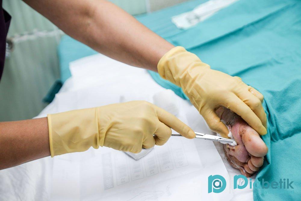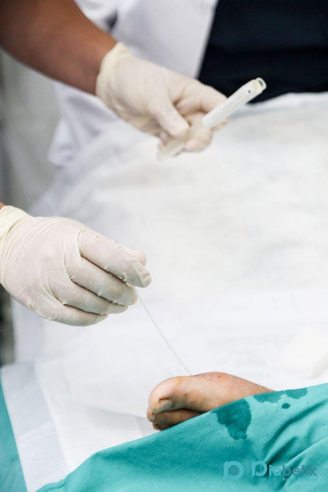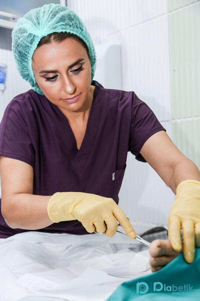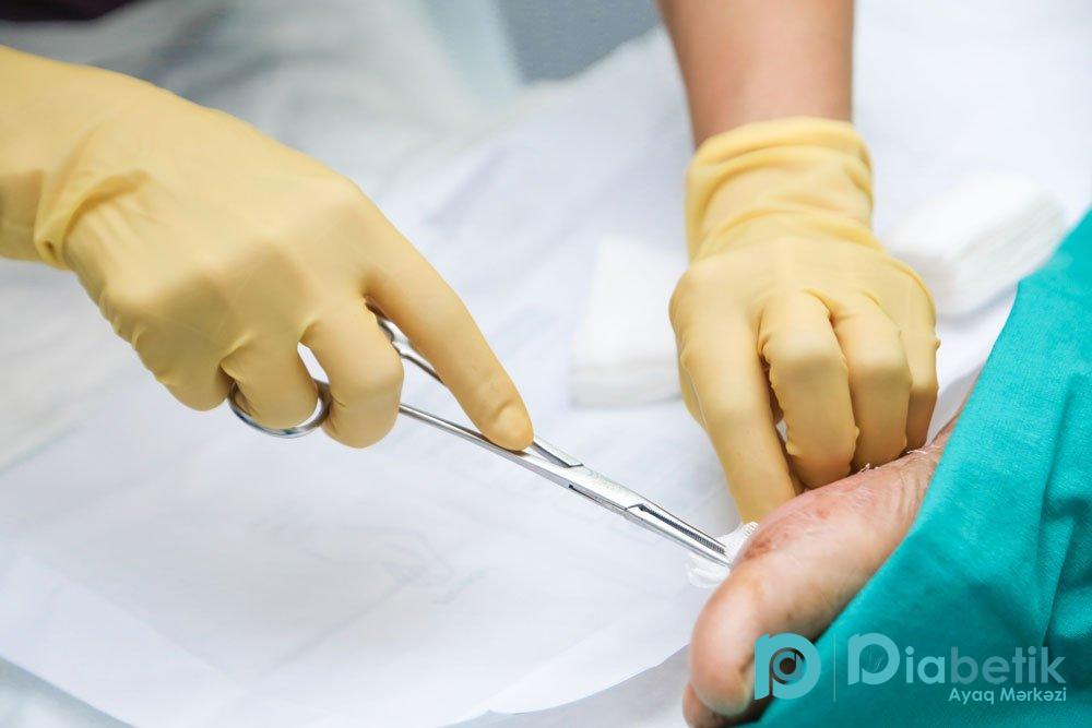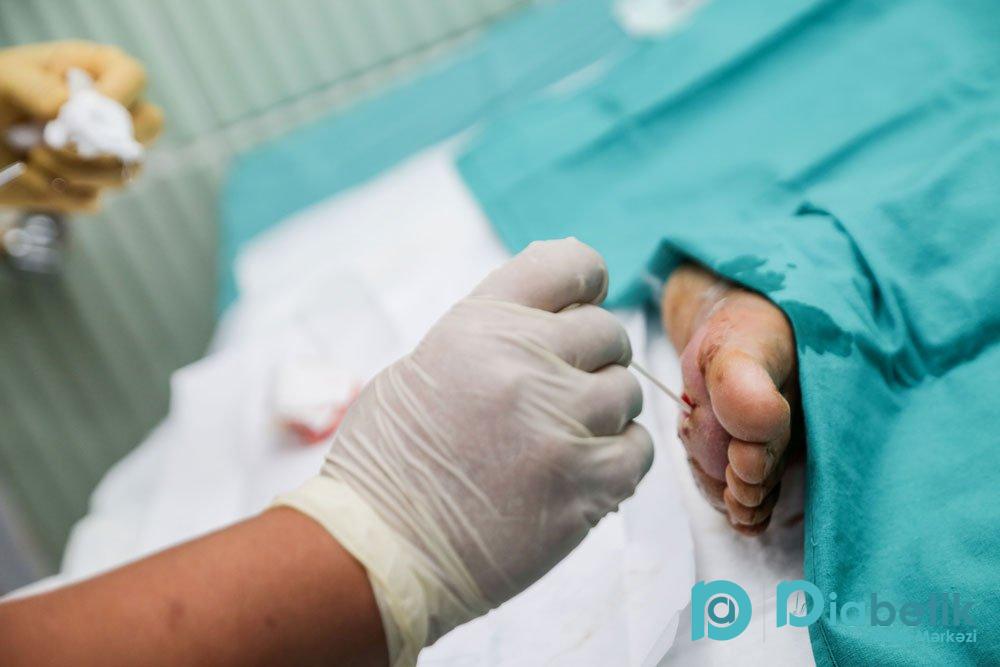 5. Angiopatiya müalicəsi. Diabetik xəstələrdə periferik arterial xəstəliyində daha çox dizaltı arteriyalar zədələnir. Tutulmuş və ya daralmış periferik damarlar ya invaziv olaraq balon angioplastika üsulu ilə, ya da xəstənin öz venasından (safen vena) götürülmüş və ya süni damar ilə femoro-distal bypass üsulu ilə əməliyyat olunaraq açılır.